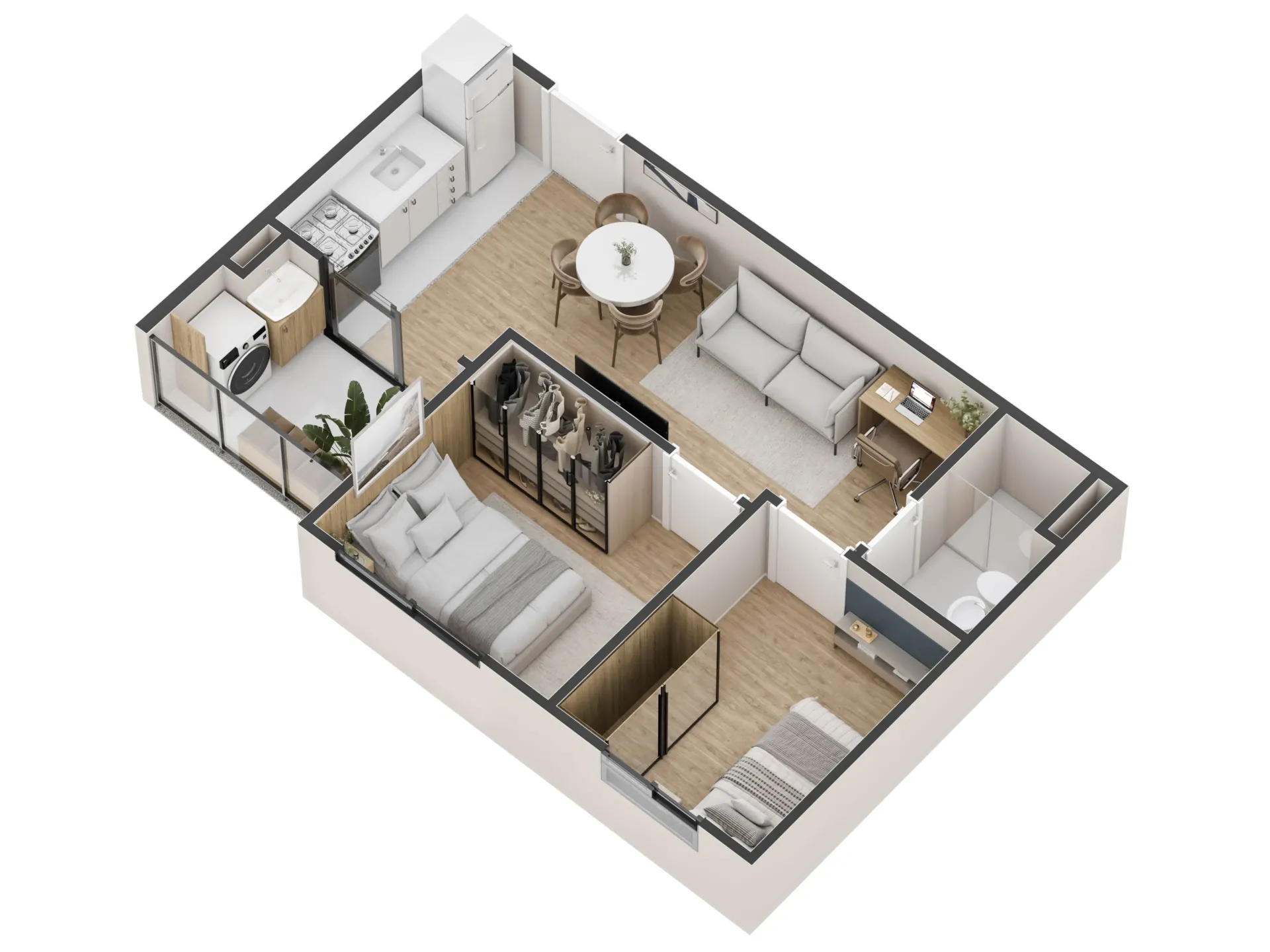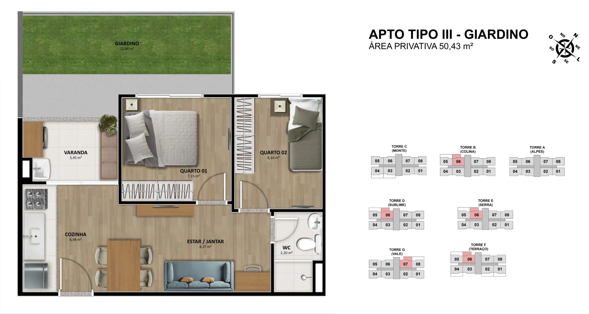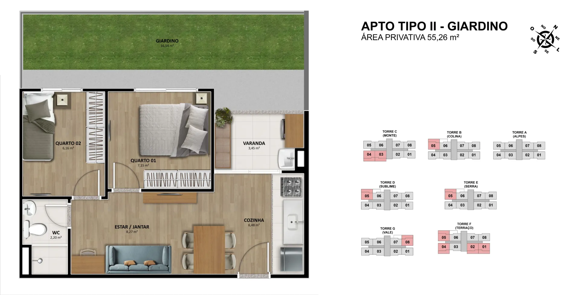 Apartamentos de 2 quartos e área privativa de 37,62 m². Apartamentos de 2 quartos com giardino e área privativa de 50,43 m² e 55,26 m².Total de torres